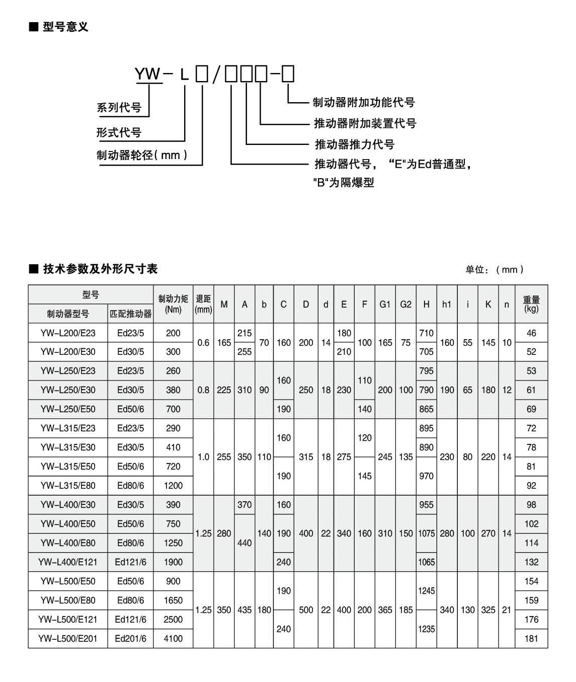 應(yīng)用:YW,YWZ13系列電力液壓鼓式制動(dòng)器,廣泛應(yīng)用于有防爆要求的各種起重運(yùn)輸、皮帶運(yùn)輸、港口裝卸、冶金及建筑機(jī)械中各種機(jī)構(gòu)的減速和停車(維持)制動(dòng)。符合標(biāo)準(zhǔn):YW-L系列制動(dòng)器連接尺寸及制動(dòng)力矩參數(shù)符合JB/T6406-2006標(biāo)準(zhǔn)和DIN15435標(biāo)準(zhǔn)。配套符合DIN15430標(biāo)準(zhǔn)的Ed系列推動(dòng)器。主要特點(diǎn):▲ 聯(lián)鎖式退距均等裝置和瓦塊自動(dòng)隨位裝置,可始終保持兩側(cè)瓦塊退距均等且無需調(diào)整,完全避免因退距不均使一側(cè)制動(dòng)襯墊浮貼制動(dòng)輪的現(xiàn)象;▲ 主要擺動(dòng)鉸點(diǎn)均設(shè)有自潤(rùn)滑軸承,傳動(dòng)效率高,壽命長(zhǎng),使用中無需潤(rùn)滑;▲ 制動(dòng)彈簧在方管內(nèi)布置并設(shè)有標(biāo)尺,用戶可十分方便地讀出制動(dòng)力矩值,免去測(cè)量和計(jì)算的麻煩;▲ 制動(dòng)襯墊為卡裝式整體成型結(jié)構(gòu),更換十分方便、快捷,備有半金屬(無石棉)硬質(zhì)和半硬質(zhì),軟質(zhì)(無石棉)等不同材質(zhì)的制動(dòng)襯墊供用戶選擇;▲ 配套Ed系列電力液壓推動(dòng)器產(chǎn)品,動(dòng)作靈敏、使用壽命長(zhǎng);▲ 常閉式設(shè)計(jì),(斷電)彈簧制動(dòng),(通電)推動(dòng)器釋放。工作條件:◆ 海拔高度:<2000m;◆ 環(huán)境溫度:-20°C?+ 40°C;◆ 相對(duì)濕度:≤90%;◆ 工作制:間歇性(S3-60%)和連續(xù)(S1);◆ 電源電壓:三相交流,AC380 50Hz (其他電源等級(jí)可按需要定制);◆ 有特殊要求時(shí)在訂貨時(shí)協(xié)商確定。基本參數(shù):● 產(chǎn)品型號(hào):YW-L200、YW-L250、YW-L315、YW-L400、YW-L500● 適用輪徑:200~500mm● 制動(dòng)力矩:200~4100Nm