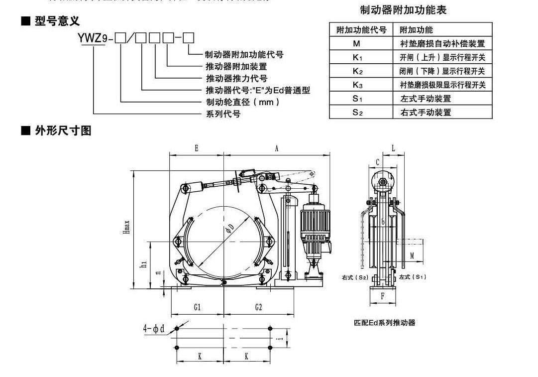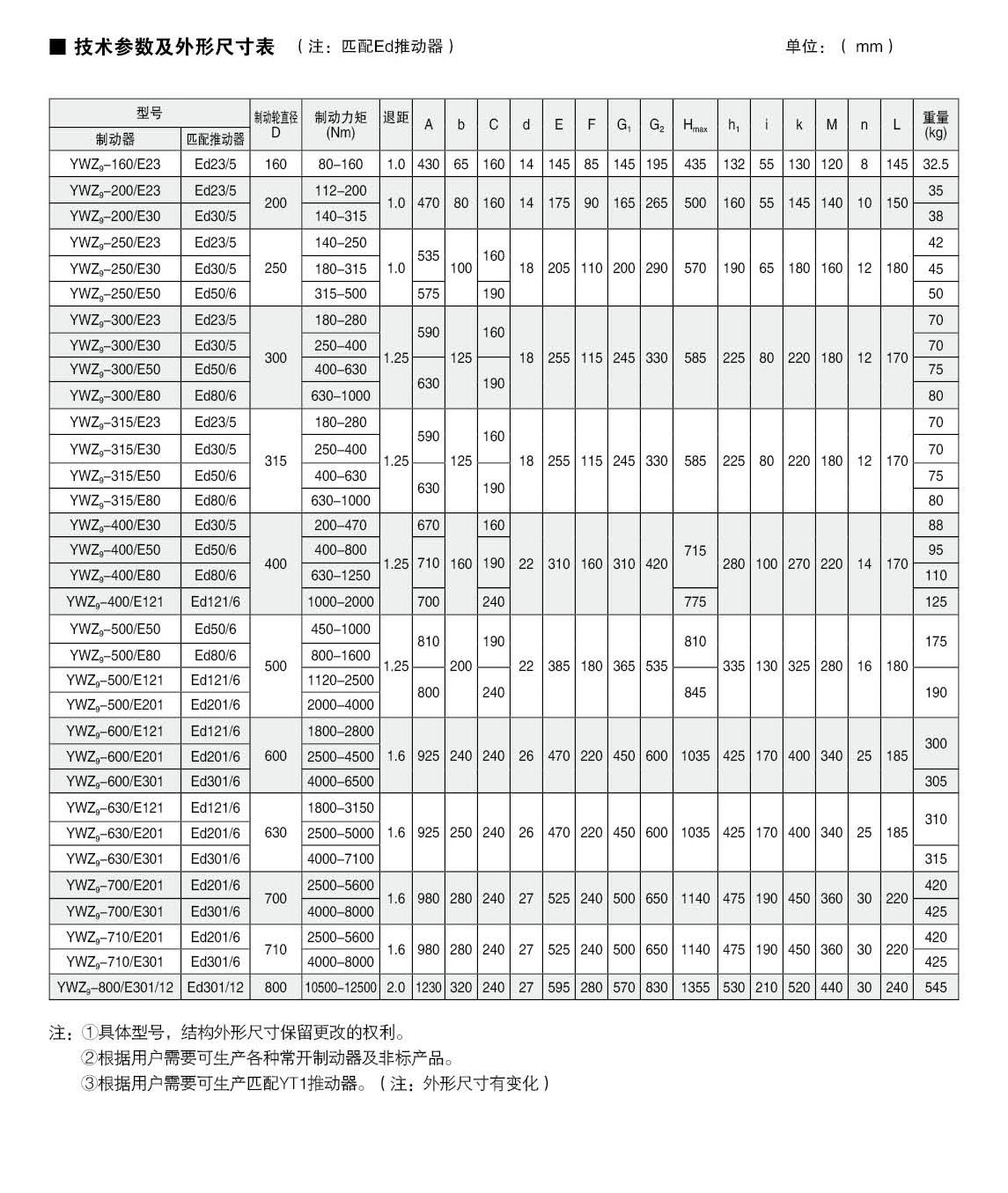 應(yīng)用:YWZ5  YWZ9系列電力液壓鼓式制動器,廣泛應(yīng)用于有防爆要求的各種起重運輸、皮帶運輸、港口裝卸、冶金及建筑機(jī)械中各種機(jī)構(gòu)的減速和停車(維持)制動。符合標(biāo)準(zhǔn):YWZ5系列電力液壓鼓式制動器的連接尺寸和制動力矩參數(shù)符合GB6333-86標(biāo)準(zhǔn),技術(shù)要求符合JB / T6406-2006標(biāo)準(zhǔn),配套符合DIN15430標(biāo)準(zhǔn)的Ed系列推動器。主要特點:▲ 聯(lián)鎖式退距均等裝置和瓦塊自動隨位裝置,可始終保持兩側(cè)瓦塊退距均等且無需調(diào)整,完全避免因退距不均使一側(cè)制動襯墊浮貼制動輪的現(xiàn)象;▲ 主要擺動鉸點均設(shè)有自潤滑軸承,傳動效率高,壽命長,使用中無需潤滑;▲ 制動彈簧在方管內(nèi)布置并設(shè)有標(biāo)尺,用戶可十分方便地讀出制動力矩值,免去測量和計算的麻煩;▲ 制動襯墊為卡裝式整體成型結(jié)構(gòu),更換十分方便、快捷,備有半金屬(無石棉)硬質(zhì)和半硬質(zhì),軟質(zhì)(無石棉)等不同材質(zhì)的制動襯墊供用戶選擇;▲ 配套Ed系列電力液壓推動器產(chǎn)品,動作靈敏、使用壽命長;▲ 常閉式設(shè)計,(斷電)彈簧制動,(通電)推動器釋放。工作條件:◆ 海拔高度:<2000m;◆ 環(huán)境溫度:-20°C?+ 40°C;◆ 相對濕度:≤90%;◆ 工作制:間歇性(S3-60%)和連續(xù)(S1);◆ 電源電壓:三相交流,AC380 50Hz (其他電源等級可按需要定制);◆ 有特殊要求時在訂貨時協(xié)商確定?;緟?shù):● 產(chǎn)品型號:YWZ5-160、YWZ5-200、YWZ5-250、YWZ5-315、YWZ5-400、YWZ5-500、YWZ5-630、YWZ5-710、YWZ5-800● 適用輪徑:160~800mm● 制動力矩:80~12500Nm● 產(chǎn)品型號:YWZ9-160、YWZ9-200、YWZ9-250、YWZ9-300、YWZ9-315、YWZ9-400、YWZ9-500、YWZ9-600、YWZ9-630、YWZ9-700、YWZ9-710、YWZ9-800● 適用輪徑:160~800mm● 制動力矩:80~12500Nm